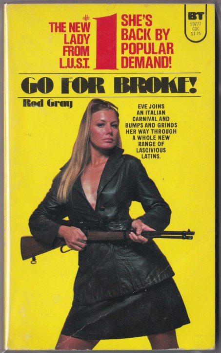New York, New York: Belmont Tower Books, 1975. Presumed First Edition. MMPB. Good+/None. Eve joins an Italian carnival and bumps and grinds her way through a whole new range of lascivious Latins… Bigger! Bouncier! Bustier! ** And no, that is not referring to the form-fitting lingerie item! Ultra-gratuitous dude fiction smut from the reboot of the Lady from L.U.S.T. series on Belmont Tower. Spine has an area suggesting some buckling, but still feels strong otherwise. One cover crease. Teal dyed page edges. Kept in poly sleeve for protection. Packed and shipped with care.